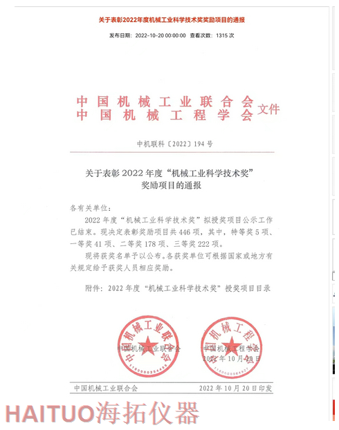 海拓儀器榮獲2022年度中國機械工業(yè)科學(xué)技術(shù)獎?ICC訊?10月20日,2022年度“中國機械工業(yè)科學(xué)技術(shù)獎”項目名錄正式發(fā)布,由海拓儀器(江蘇)有限公司完成的“超快速冷熱沖擊試驗系統(tǒng)關(guān)鍵技術(shù)研究與系列應(yīng)用”項目榮獲2022年度“中國機械工業(yè)科學(xué)技術(shù)獎”三等獎。??據(jù)了解,中國機械工業(yè)科學(xué)技術(shù)獎是根據(jù)《國家科學(xué)技術(shù)獎勵條例》和《社會力量設(shè)立科學(xué)技術(shù)獎管理辦法》的有關(guān)規(guī)定,由中國機械工業(yè)聯(lián)合會和中國機械工程學(xué)會共同設(shè)立并經(jīng)國家科學(xué)技術(shù)部批準,在國家科技獎勵主管部門登記的面向全國機械行業(yè)的綜合性科技獎項。旨在表彰在機械工業(yè)科技工作中作出突出貢獻的單位和人員,獎勵范圍包括:機械工業(yè)科學(xué)技術(shù)發(fā)明成果、機械工業(yè)科學(xué)技術(shù)進步成果、機械工業(yè)工程化和新技術(shù)推廣成果和機械工業(yè)軟科學(xué)和標準成果。??海拓儀器是一家集研發(fā)、制造、貿(mào)易于一體高科技現(xiàn)代化公司,公司成立于2005年,主要產(chǎn)品包括:超快速冷熱沖擊試驗機(熱流儀)、快速溫變應(yīng)力篩選試驗箱(ESS), -